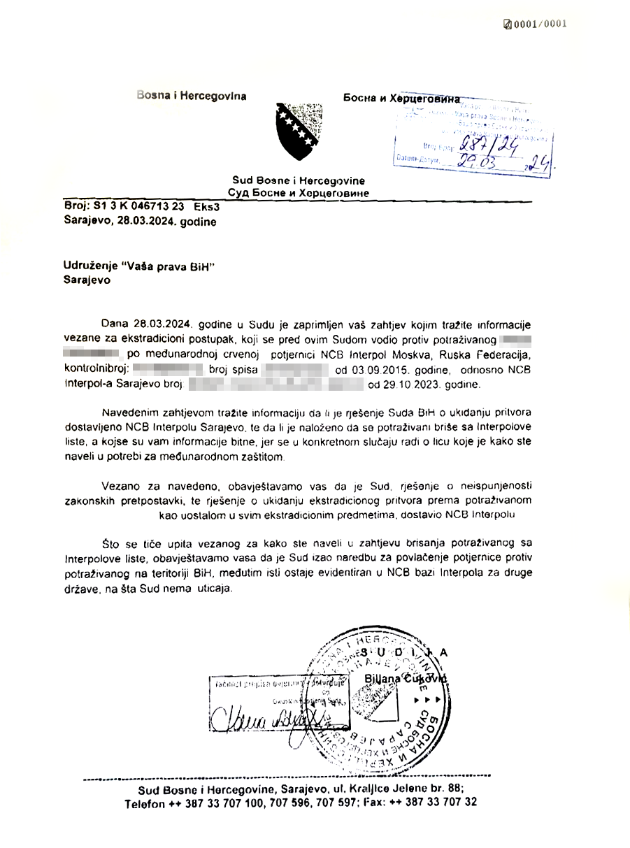 Чиллан-баттахь кхел дуьхьал хилира цунна Оьрсийчу экстрадици йан, ткъа зазадокху-баттахь юстицин министралло и сацам тIечIагIбира. Цигахь хаамбира, Оьрсийчоьнан дехар дIатеттина, хIунда аьлча, Нохчийчуьра вахархочо тховкIело йехна хIинцале а аьлла. Боснин а. Герцеговинан а низамо бакъо ца ло, нагахь санна дуьйцург тIеман йа политикан зулам делахь, экстрадици йар.
